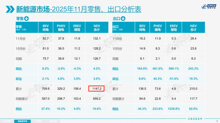 1-11月,新能源车累计销量超1147万,整个市场的销量(狭义乘用车)累计接近2150万,零售板块,“电车”的销量占比已经超过了53%。